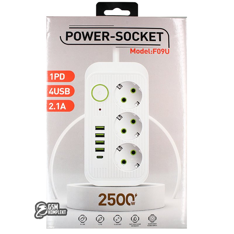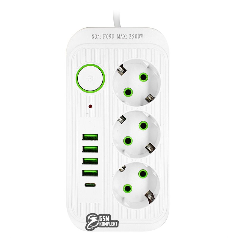 Фильтр сетевой F09, на 3 розетки, с зарядными портами 4USB, 1Type-C, белый (157203)