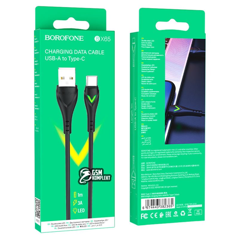 Кабель Type-C - USB, Borofone BX65, с индикатором, 1 метр, 3А, черный (157858)