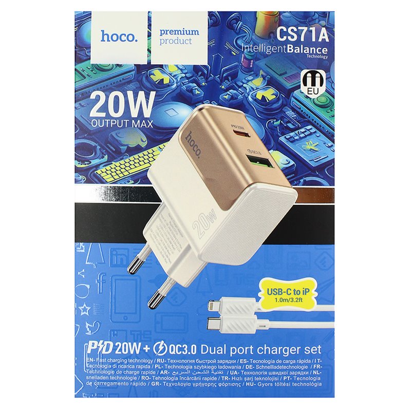 Зарядное устройство Hoco CS71A, USB, Type-C PD20Вт QC3.0, с Type-C - Lightning кабелем (173685)