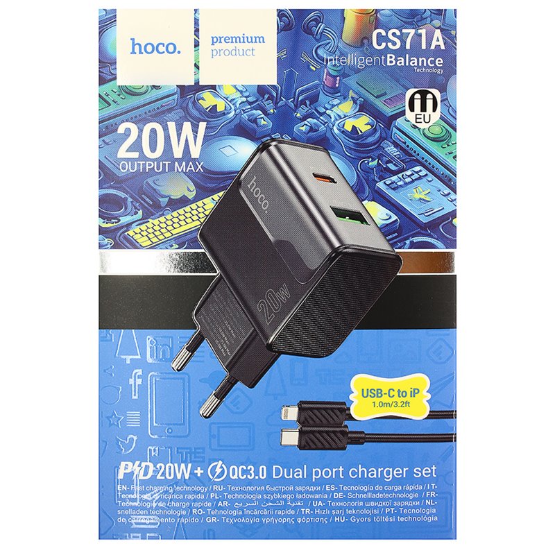 Зарядное устройство Hoco CS71A, USB, Type-C PD20Вт QC3.0, с Type-C - Lightning кабелем, midnight black (173683)