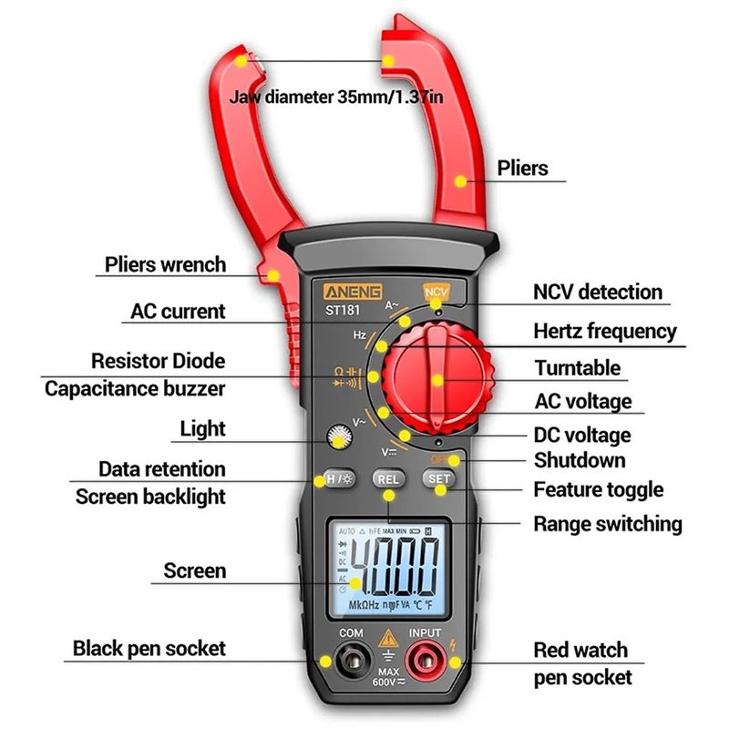 Токоизмерительные клещи Aneng ST181 с автоопределением, детектором скрытой проводки, подсветкой (ток до 40A) (173908)