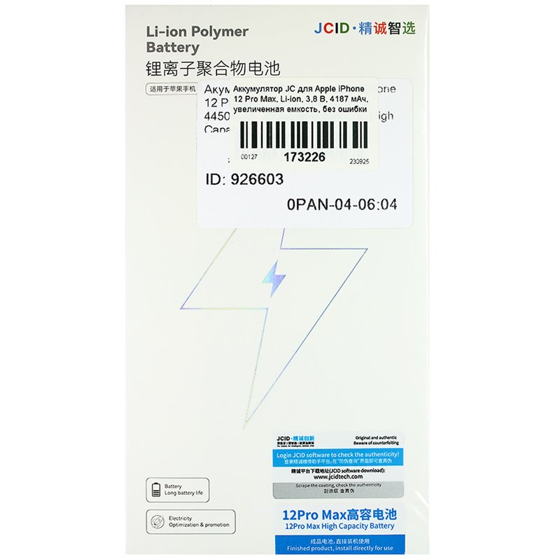 Аккумулятор JC для Apple iPhone 12 Pro Max, Li-ion, 3,8 В, 4187 мАч, увеличенная емкость, без ошибки (173226)