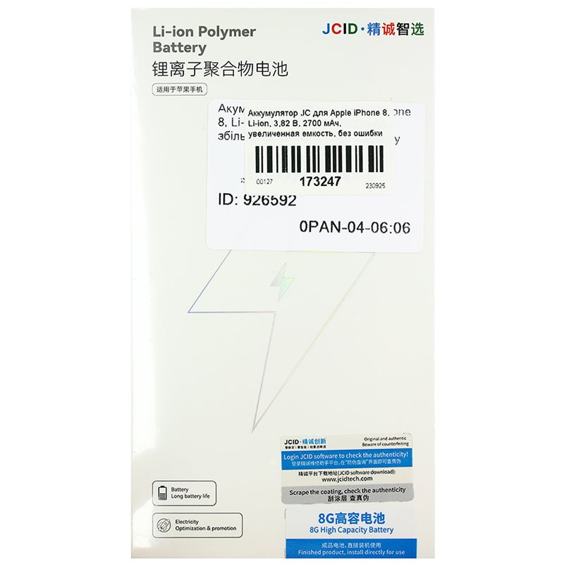 Аккумулятор JC для Apple iPhone 8, Li-ion, 3,82 В, 2700 мАч, увеличенная емкость, без ошибки (173247)