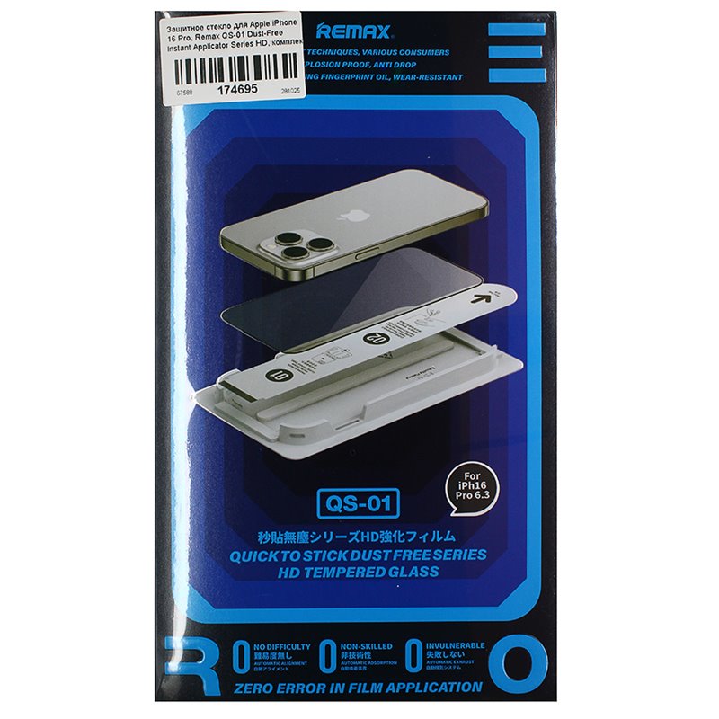 Защитное стекло для Apple iPhone 16 Pro, Remax QS-01 Dust-Free Instant Applicator Series HD, комплект для легкой установки (174695)