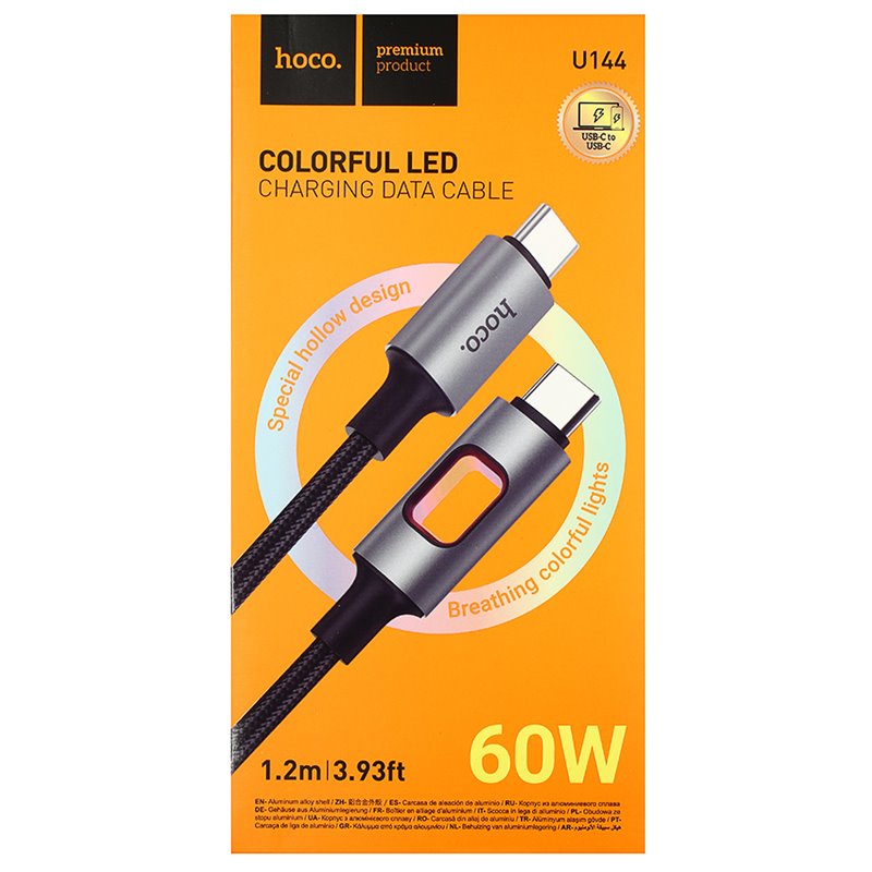 Кабель Type-C - Type-C, Hoco U144 New PD charging data, 60Вт, 1.2 метр, с LED индикатором, черный (175485)