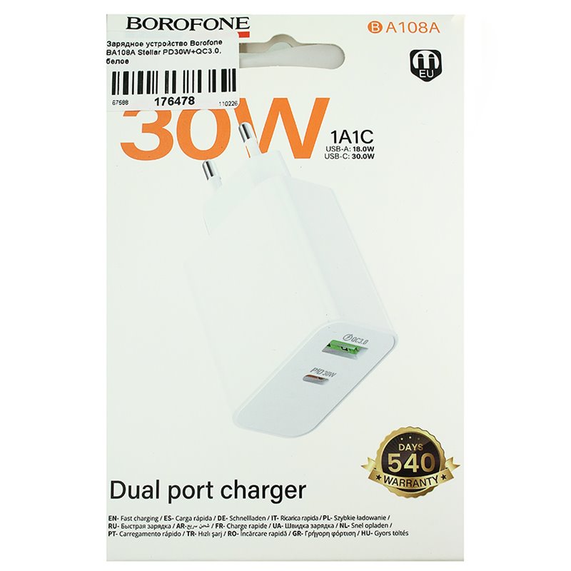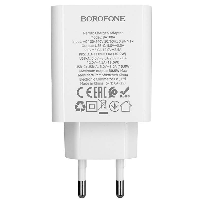 Зарядное устройство Borofone BA108A Stellar PD30W+QC3.0, белое (176478)