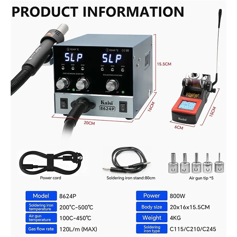 Паяльная станция прецизионная Kaisi 8624P-245, фен 100C - 450C, паяльника стандарта JBC 245, 6 каналов памяти, 800W, 200 C - 500 C (176681)