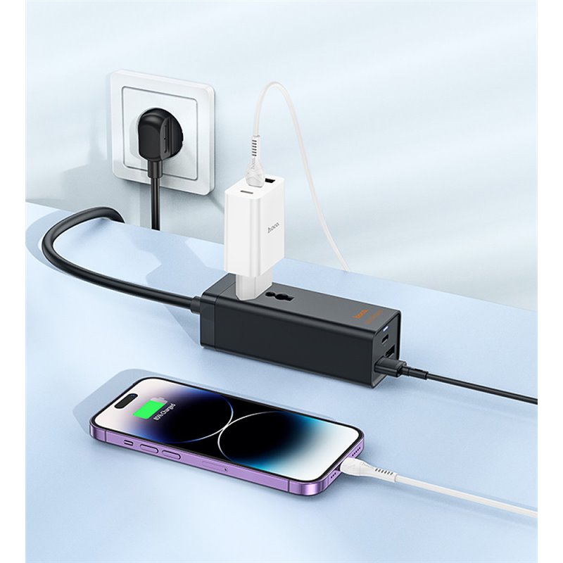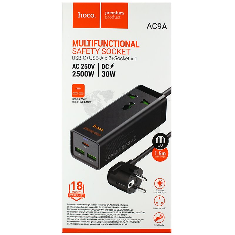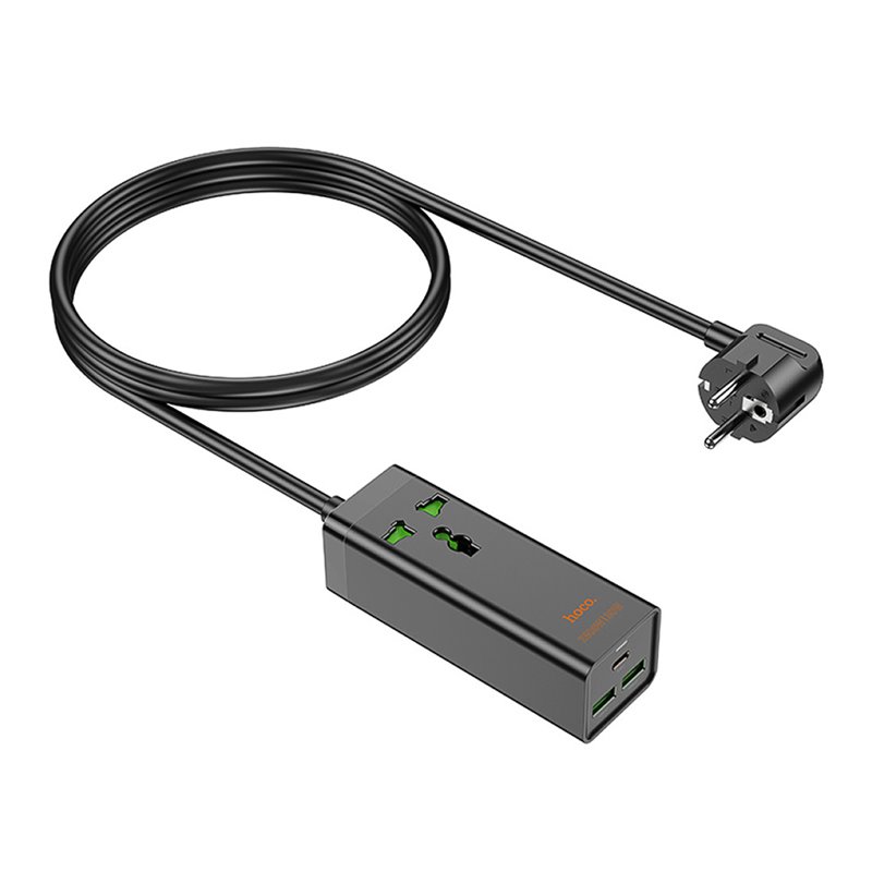 Подовжувач Hoco AC9A на 1 розетку, USB порт і Type-C PD 30W порт для зарядки, шнур: 1,5 м, чорний (173717)