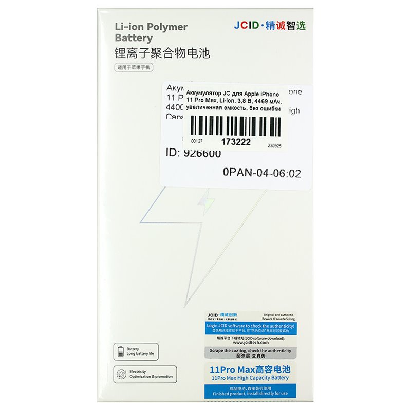 Акумулятор JC для Apple iPhone 11 Pro Max, Li-ion, 3,8 В, 4469 мАг, збільшена ємність, без помилки (173222)