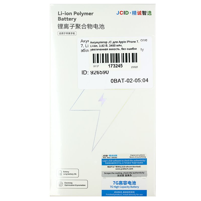Акумулятор JC для Apple iPhone 7, Li-ion, 3,82 В, 2400 мАг, збільшена ємність, без помилки (173245)