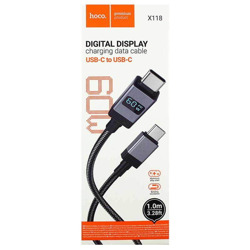 Кабель Type-C - Type-C, Hoco X118, 1 м, PD 60W, в тканинному обплетенні, з дисплеєм, чорний (173674)