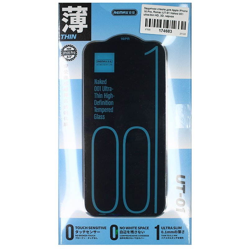 Захисне скло для Apple iPhone 16 Pro, Remax UT-01 Naked 001 ultra-thin HD, 3D, чорне (174683)