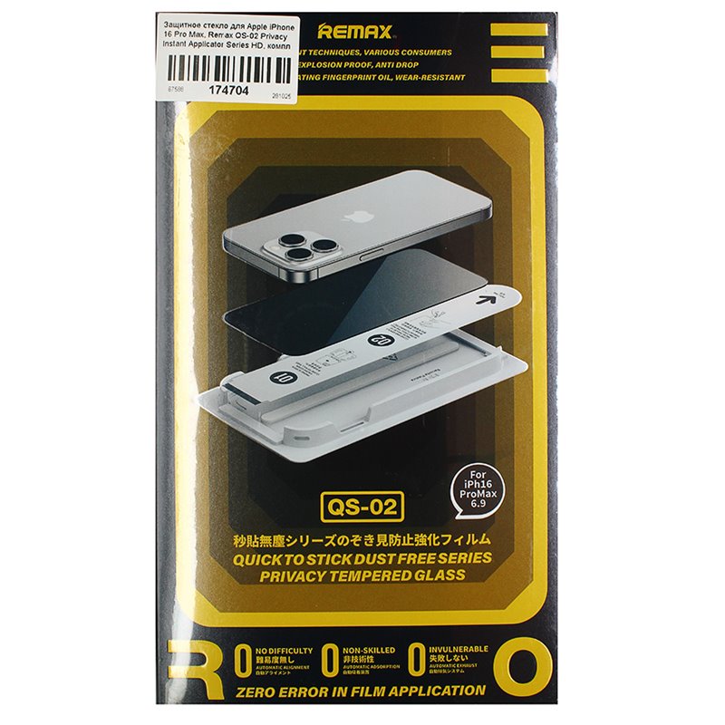 Захисне скло для Apple iPhone 16 Pro Max, Remax QS-02 Privacy Instant Applicator Series HD, комплект для легкої установки, антишпигун (174704)